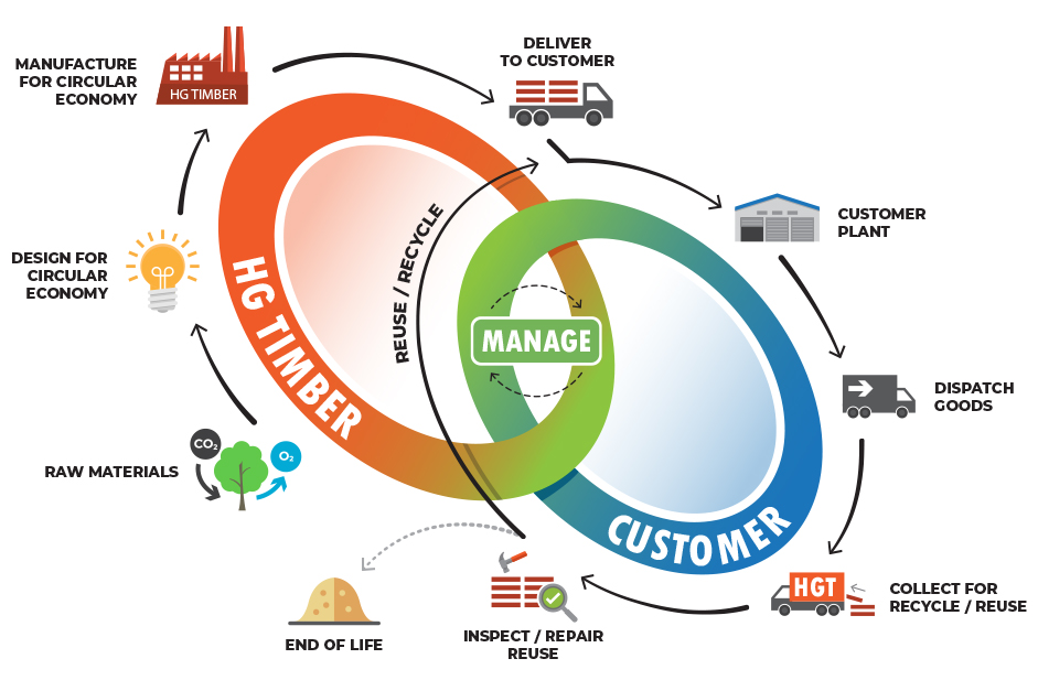 Working hand in hand with our customers supply chain with a deposit system encouraging the pallet to be returned thus reducing pallet waste, by keeping pallets in a circular economy, pallets are kept in circulation through processes like maintenance, reuse, refurbishment, remanufacture, recycling, and end of life composting.
